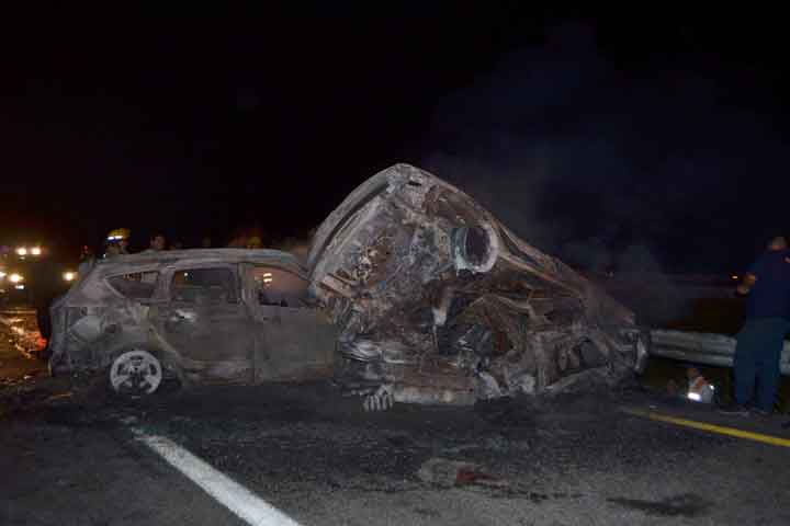 Un choque frontal entre dos automóviles dejó como saldo cuatro personas fallecidas calcinadas sobre la autopista México-Guadalajara, exactamente en el kilómetro 241+100, a la altura de esta municipalidad. En el lugar trascendió que uno de los vehículos era perseguido por agentes federales y en su intento de huida se metió en sentido contrario provocando la tragedia.