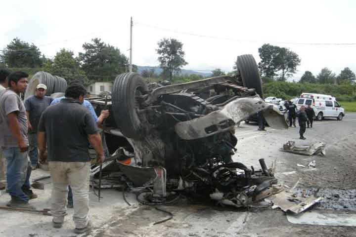 Un camión cargado con varias toneladas de cemento, se volcó en la llamada "Curva del Diablo", del tramo de la carretera Paracho - Uruapan; la unidad quedó sobre su toldo y en el interior, prensado y sin vida, quedó uno de los tripulantes. El chofer salió disparado de la unidad y quedó gravemente herido.