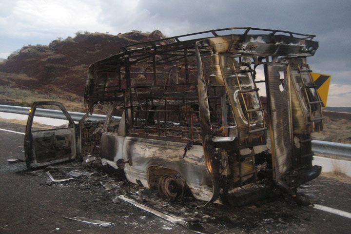 La tarde del pasado lunes fue encontrada una camioneta totalmente calcinada y en la caja de la misma se localizó el cadáver de una persona del sexo masculino también quemada, quien al parecer fue asesinada de dos balazos, toda vez que a un lado del cuerpo había dos casquillos percutidos calibre .9 milímetros.