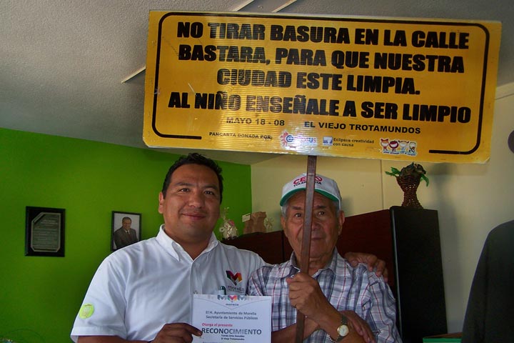NOTICIAS 14/12/2013Un viejo trota-mundos en Morelia Fue en el año 2008 cuando por primera vez Don Tomás Ortiz González, con 90 años de edad actualmente, inició un recorrido por diversos lugares de México para transmitir -por medio de una pancarta- un mensaje de conciencia ecológica a la sociedad y con ello contribuir a mantener un país más limpio; por ello, en homenaje a esta noble labor social, el Ayuntamiento de Morelia le hizo entrega de un reconocimiento durante su segunda visita a l... Ver más...