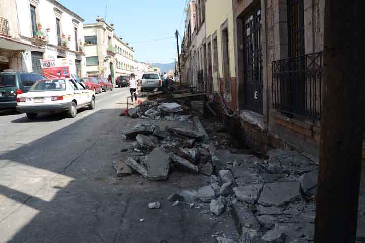 En cumplimiento a los ejes de trabajo por un Morelia Transitable y un Morelia Seguro, la Secretaría de Obras Públicas local (SOP) realiza trabajos de rehabilitación en las banquetas de la calle Aldama en el Centro Histórico.