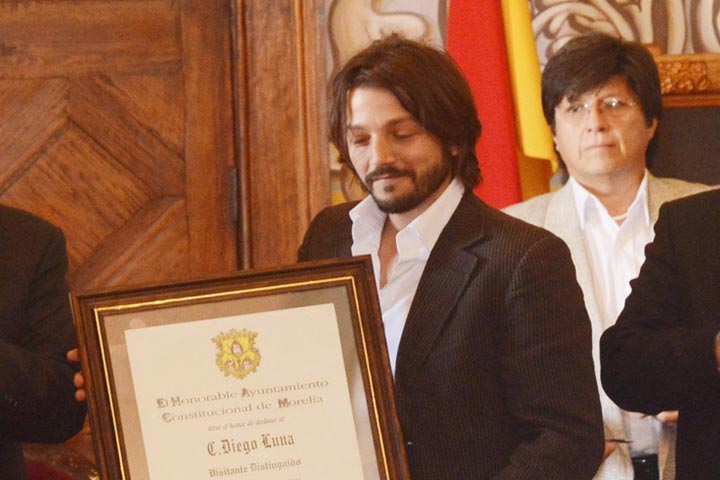NOTICIAS 19/10/2013Diego Luna es huésped distinguido de MoreliaEn sesión Solemne, el Cabildo de Morelia entregó el reconocimiento de Huésped Distinguido de la Ciudad al actor mexicano Diego Luna. En el marco de la celebración del Festival Internacional de Cine el también director expreso su agradecimiento al presidente municipal, Wilfrido Lázaro Medina y al Ayuntamiento por la muestra del cariño del público moreliano a través de esta distinción.