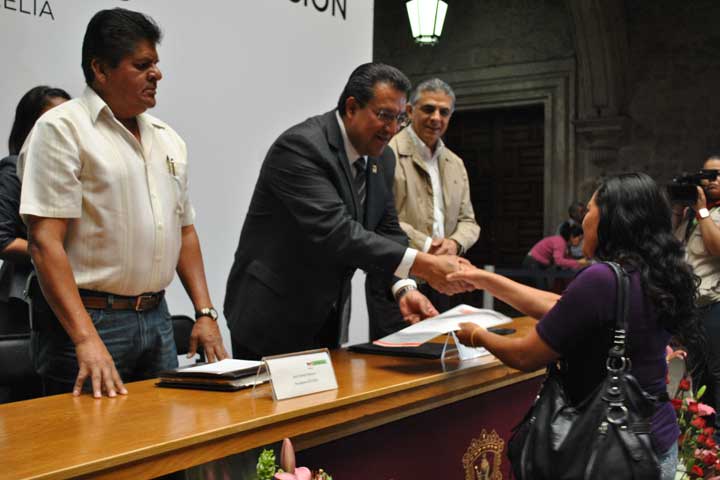 Son 77 escrituras las que se entregaron esta mañana en el patio central de Palacio Municipal, a fin de beneficiar a la colonia Felipe Sandoval de la ciudad de Morelia.