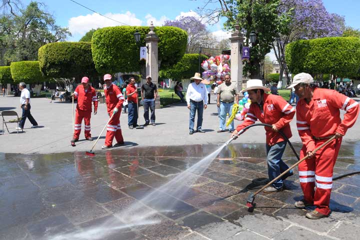 La Secretaría de Servicios Públicos, a través de la Dirección de Aseo Público, realiza jornadas de limpieza en las plazas públicas del municipio, atendiendo a la instrucción del presidente municipal, Wilfrido Lázaro Medina, de ofrecer a los morelianos y visitantes espacios limpios y en buen estado.