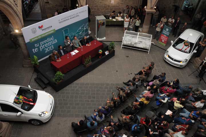 A las 11 horas de este jueves el ayuntamiento de Morelia, a través de la Tesorería Municipal, celebrará el sorteo de dos automóviles último modelo, tabletas electrónicas y varios electrodomésticos como refrigeradores y televisiones. El Presidente Municipal cumple con el compromiso de premiar a los contribuyentes que cumplieron en tiempo y forma con su pago del predial.