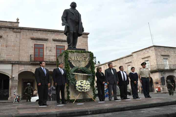 Autoridades estatales y municipales asistieron este miércoles a la Plaza Benito Juárez del Centro Histórico de Morelia con el fin de conmemorar el CXL Aniversario Luctuoso del Licenciado Benito Juárez García, donde Juan Ávila Osorio, representante de la Muy Respetable la Gran Logia Michoacán Lázaro Cárdenas y orador oficial.