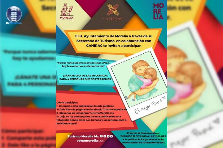 NOTICIAS 11/06/2020SECTUR Morelia y CANIRAC suman esfuerzos para llevar regalos para el día del padre El Ayuntamiento de Morelia a través de su Secretaría de Turismo y en coordinación con la Cámara Nacional de la Industria Restaurantera y Alimentos Condimentados CANIRAC en Michoacán, llevan a cabo un concurso donde se obsequiarán 50 comidas para 4 personas en distintos restaurantes de la ciudad adheridos a esta cámara empresarial.