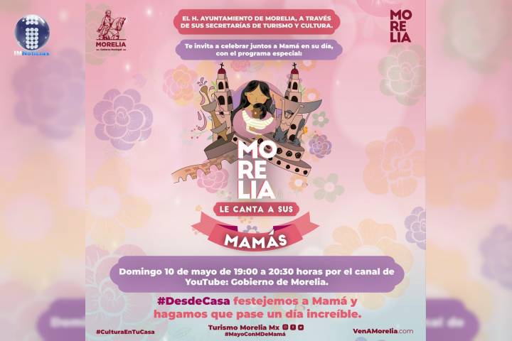 NOTICIAS 08/05/2020Gobierno de Morelia celebrará a las mamás este 10 de mayo El Ayuntamiento de Morelia, a través de su Secretaría de Turismo, celebrará a las mamás este próximo 10 de mayo con una programación especial que será transmitida a través de la plataforma de YouTube en el canal de Gobierno de Morelia y en el cual se han sumado distintos medios de comunicación radiofónicos y televisivos en un horario de 19:00 a 20:30 horas.