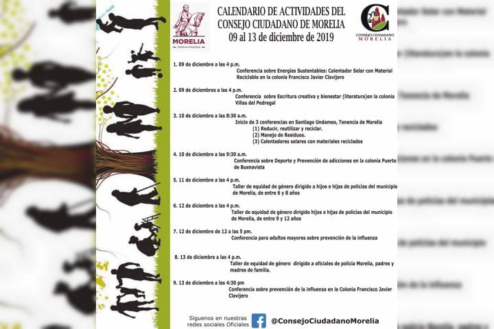 NOTICIAS 11/12/2019Trabaja Consejo Ciudadano de Morelia en reconstrucción del tejido socialCon la intención de coadyuvar a la regeneración del tejido social, recuperar espacios e incentivar una vida en comunidad, el Consejo Ciudadano de Morelia, realiza desde este lunes y hasta el viernes 13 de diciembre, una serie de actividades, conferencias y talleres, en colonias vulnerables del municipio.