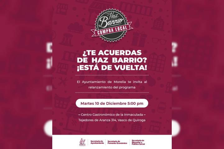 NOTICIAS 02/12/2019Regresa Haz Barrio, cuenta con APP digital y mayor promociónEl Ayuntamiento de Morelia a través de la Secretaría de Fomento Económico anunció que el próximo martes 10 de diciembre, a las 17:00 horas, en el Centro Gastronómico de la Parroquia de la Inmaculada de la colonia Vasco de Quiroga, relanzará el Programa "Haz Barrio".