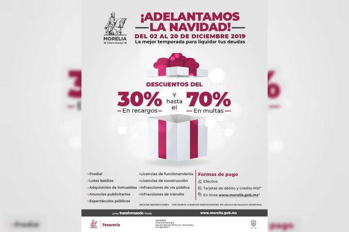 NOTICIAS 03/12/2019Tesorería de Morelia te "Adelanta la Navidad"Con el objetivo de abatir el rezago en la cartera vencida de aquellos predios en situación de mora, dando respuesta positiva y clara a la situación de desaceleración económica que enfrenta el municipio de Morelia, la Tesorería municipal permitirá a los contribuyentes asegurar su patrimonio al quedar al corriente en sus contribuciones.