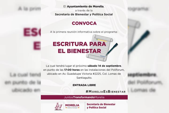 NOTICIAS 13/09/2019Invita Gobierno de Morelia a conocer el programa "Escritura para el Bienestar"Con el fin de asesorar sobre el proceso de regularización de los predios irregulares en la ciudad de Morelia, se realizará la primera reunión informativa respecto al programa "Escritura para el Bienestar", con el cual el Gobierno de Morelia, a través de la Secretaría de Bienestar y Política Social busca brindar seguridad jurídica a las familias morelianas.