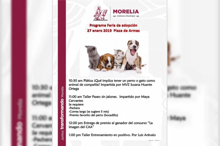 NOTICIAS 26/01/2019Talleres, pláticas y más, en la Feria de AdopciónCon el propósito de continuar fomentando el respeto a la vida animal, el Ayuntamiento de Morelia que preside el Alcalde, Raúl Morón Orozco, invita a la ciudadanÃa a participar en la próxima Feria de Adopción.