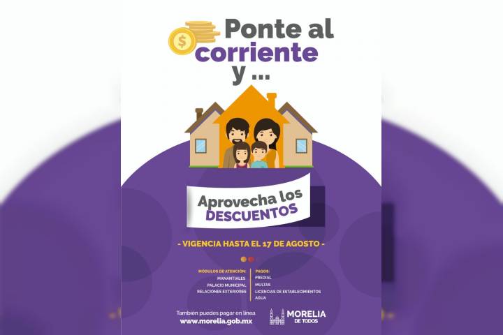 NOTICIAS 17/08/2018Último dÃa de descuentos en pagos municipalesEl Ayuntamiento de Morelia, a través de la TesorerÃa Municipal, informa que este viernes 17 de agosto es el último dÃa de los actuales descuentos en pagos de diversos cobros y servicios, por lo cual se extiende una invitación a toda la ciudadanÃa a aprovechar estas facilidades en beneficio de la economÃa familiar.