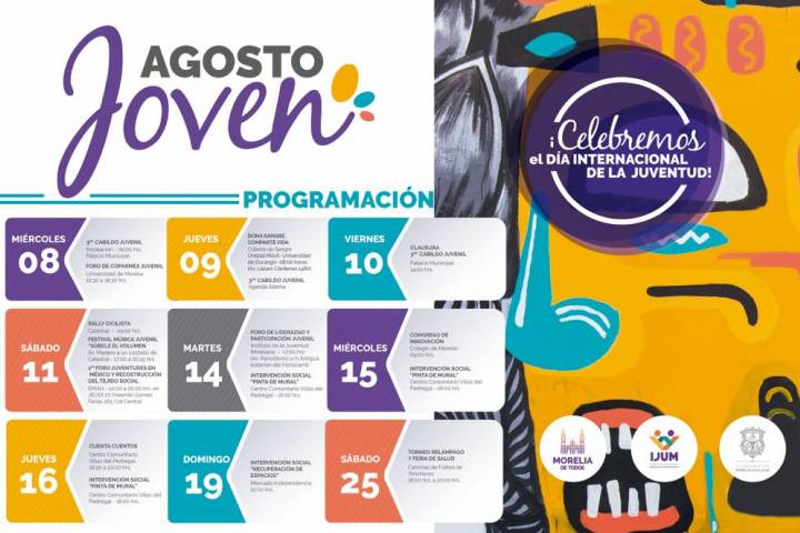 NOTICIAS 07/08/2018Todo listo para vivir el "Agosto Joven" en MoreliaCon el propósito de seguir fomentando el desarrollo integral de este sector en la Capital Michoacana, el Ayuntamiento de Morelia a través del Instituto de la Juventud (IJUM) invitan a la población a formar parte de las actividades enfocadas al sector juvenil que se llevarán a cabo del ocho al 25 de agosto del presente año mediante el programa "Agosto Joven".
