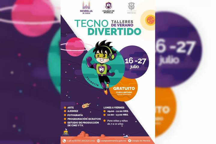NOTICIAS 03/07/2018Colegio de Morelia prepara talleres de verano "Tecnodivertido" Con la finalidad de seguir promoviendo la educación y fomentar el interés por la tecnología, la ciencia y el arte, el Colegio de Morelia anunció que del 16 al 27 de julio llevará a cabo los talleres de verano "Tecnodivertido", los cuales serán gratuitos para niños y niñas de siete a 12 años, con horario de lunes a viernes de 9:00 a 11:00 horas y de 11:00 a 13:00 horas.