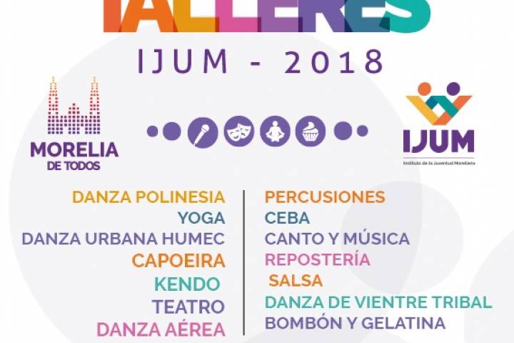 NOTICIAS 07/07/2018IMDE, IJUM y Colegio de Morelia, con oferta de cursos y talleres este verano Con la finalidad de brindarle una variedad de actividades a la ciudadanía para su desarrollo y convivencia, el Ayuntamiento de Morelia a través de algunas de sus dependencias pone a la disposición de niños, jóvenes y adultos, diversos cursos y talleres durante la próxima temporada vacacional de verano.
