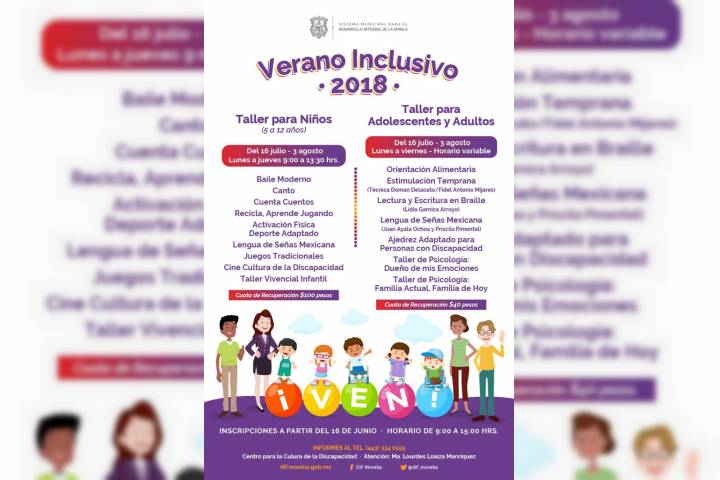 NOTICIAS 06/07/2018DIF Morelia continúa con inscripciones abiertas para "Verano Inclusivo 2018"El Sistema DIF Municipal de Morelia invita a la sociedad en general a inscribirse y participar en los talleres "Verano Inclusivo 2018", los cuales se ofrecerán a niños, adolescentes y adultos para aprender actividades inclusivas en distintos ámbitos.