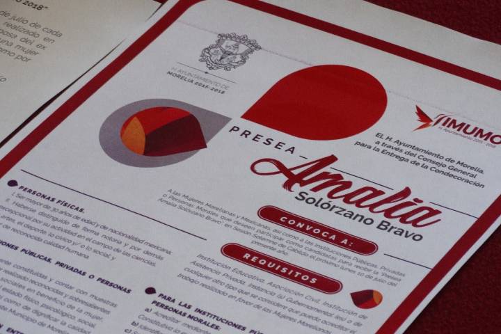 NOTICIAS 18/06/2018Últimos días de convocatoria a la "Presea Amalia Solórzano Bravo 2018"El Ayuntamiento de Morelia, a través del Instituto de la Mujer Moreliana (IMUMO), recuerda a la sociedad en general que actualmente corren los últimos días de inscripciones a la Convocatoria de la "Presea Amalia Solórzano Bravo 2018", cuyo propósito es reconocer a las personas o instituciones que coadyuven al mejoramiento de la calidad de vida de las mujeres.