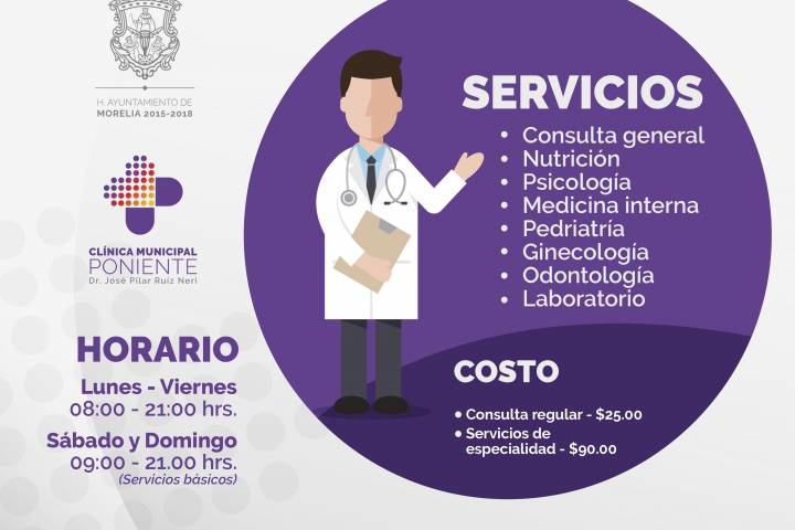 NOTICIAS 09/06/2018Servicios ampliados de Clínica Municipal Poniente, disponibles para toda la ciudadaníaEl Ayuntamiento de Morelia recuerda a la ciudadanía que la Clínica Municipal Poniente "Doctor José Pilar Ruiz Neri", cuenta con servicios médicos generales, de especialidad y de laboratorio para toda la población del municipio, sin importar su lugar de residencia o si cuentan o no con alguna afiliación de seguridad social.