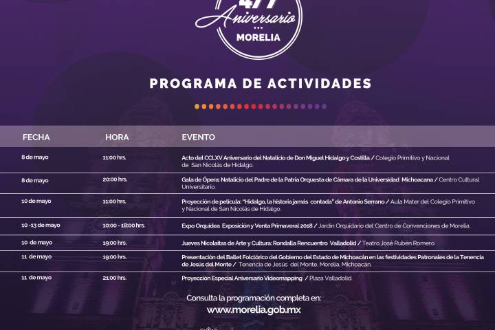 NOTICIAS 06/05/2018Más de 230 actividades, contempla programa para celebrar 477 Aniversario de MoreliaEl Ayuntamiento de Morelia recuerda a la ciudadanía en general, así como a turistas y visitantes, que con motivo del 477 Aniversario de la Fundación de la Ciudad, se ofrecerán más de 230 actividades artísticas, culturales, cívicas y académicas durante el mes de mayo.