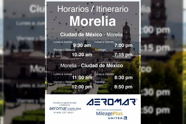 NOTICIAS 21/03/2018Incrementan número de operaciones aéreas entre Morelia y Ciudad de México Como un reflejo del crecimiento del sector turístico de Morelia y del aumento en la llegada de visitantes nacionales a la ciudad, la línea aérea Aeromar ha incrementado su número de operaciones entre la Ciudad de México y la Capital Michoacana, pasando a 10 frecuencias semanales a partir del pasado 12 de marzo.