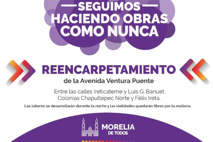 Trabajando en el objetivo de contar con más obras públicas y mejores vialidades que nunca, el Ayuntamiento de Morelia arrancará el reencarpetamiento de un tramo de la Avenida Ventura Puente.