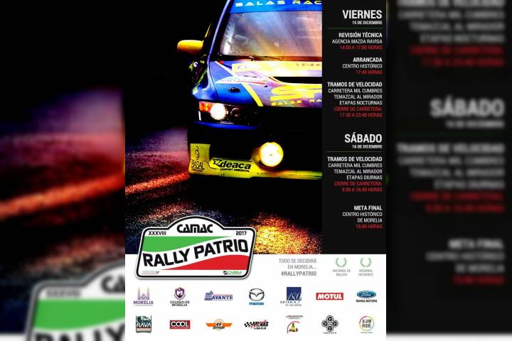 NOTICIAS 15/12/2017Morelia se prepara para recibir el "Rally Patrio" El "Rally Patrio 2017" llegará este fin de semana a la Capital Michoacana durante los días viernes 15 y sábado 16 de diciembre, teniendo como meta en el segundo día el Centro Histórico de Morelia.
