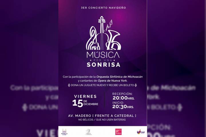 NOTICIAS 14/12/2017Primera llamada para el concierto benéfico del DIF "Música por una Sonrisa" Todo se encuentra listo para que este viernes 15 de diciembre, los morelianos disfruten del 3er. Concierto Navideño "Música por una Sonrisa" realizado por el Sistema DIF Morelia, que además de ser un espectáculo artÃstico de primer nivel gracias a la participación de la Orquesta Sinfónica de Michoacán y artistas de gran trayectoria internacional, sirve como motor principal para motivar a la ciudadanÃa moreliana a participar en la colecta... Ver más...