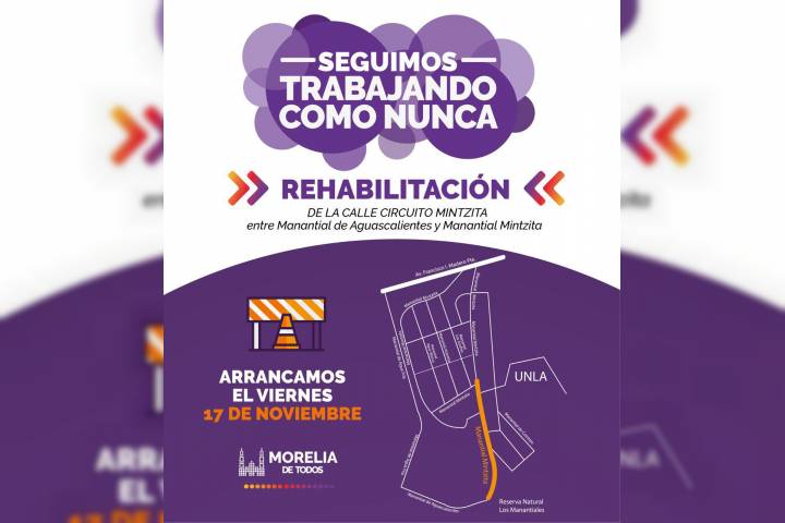 NOTICIAS 16/11/2017Este viernes arranca la rehabilitación de la calle Circuito Mintzita en Manantiales Este viernes, el Gobierno Municipal que encabeza el Acalde, Alfonso Martínez Alcázar, a través de la Secretaría de Desarrollo Metropolitano e Infraestructura, dará el banderazo inicial para el arranque de la obra de rehabilitación integral de la calle Circuito Mintzita en la colonia Manantiales, una obra solicitada por los habitantes de la zona a lo largo de años.
