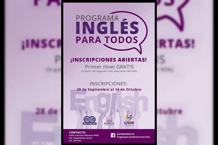 NOTICIAS 03/10/2017"Inglés para Todos" del IJUM continúa ofreciendo apoyos a la juventud El Ayuntamiento a través del Instituto de la Juventud Moreliana (IJUM) anunció a la ciudadanía que continúa la apertura de apoyos para que la ciudadanía estudie un segundo idioma mediante el programa "Inglés para Todos" del Sistema de Operaciones Lingüísticas Globales, las inscripciones están abiertas desde el pasado 28 de septiembre hasta el 14 de octubre de la presente anualidad.