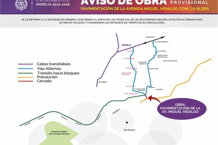 Luego de que este martes fuera iniciada por el Presidente Municipal de Morelia, Alfonso Martínez Alcázar, la obra de repavimentación de la avenida Miguel Hidalgo, que conecta la zona de Ciudad Industrial con la comunidad de La Aldea, el Gobierno Municipal, a través de la Secretaría de Desarrollo Metropolitano e Infraestructura, pone a disposición de la ciudadanía, vías alternas para el traslado por la zona.