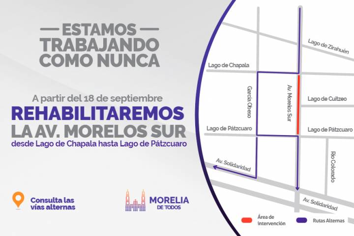 NOTICIAS 17/09/2017Continuará la transformación de importantes vialidades en Morelia: Secretaría de Desarrollo Metropolitano e InfraestructuraLa transformación de calles no para en la capital de Michoacán, por lo que el Ayuntamiento de Morelia iniciará los trabajos el próximo 18 de septiembre en la Avenida Morelos Sur en la colonia Ventura Puente, obra que supondrá el mejoramiento de una de las principales arterias de la ciudad por su conexión con el Centro Histórico, ubicación de comercios y paso del transporte público.