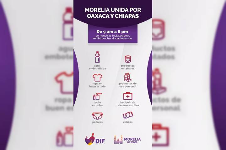 NOTICIAS 10/09/2017Gobierno Municipal pone en marcha Centro de Acopio en apoyo a vÃctimas del sismoCon la finalidad de sumarse al apoyo hacia los damnificados de Oaxaca y Chiapas luego del sismo registrado la madrugada del viernes, el Gobierno Municipal abrió este domingo un Centro de Acopio en las instalaciones de DIF Morelia en donde se recibirán los vÃveres e insumos que la ciudadanÃa desee cooperar.