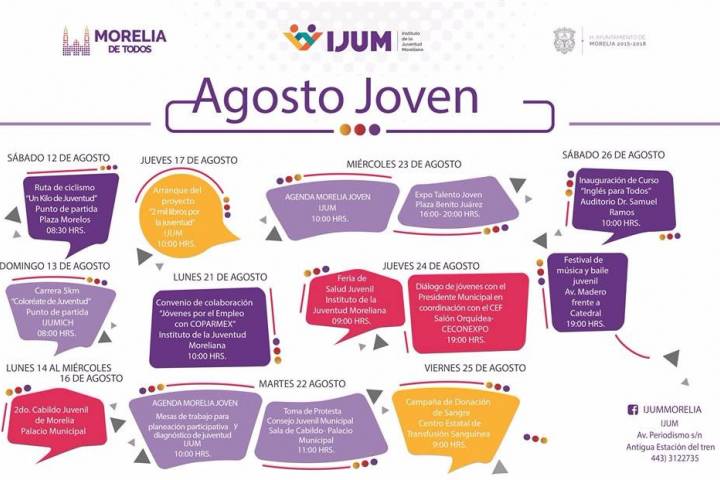 Con una amplia agenda de actividades, el Instituto de la Juventud Moreliana (IJUM) celebrará la expresión juvenil en el municipio del 12 al 26 de agosto con la acción denominada "Agosto Joven", en el marco del Día Internacional de la Juventud.