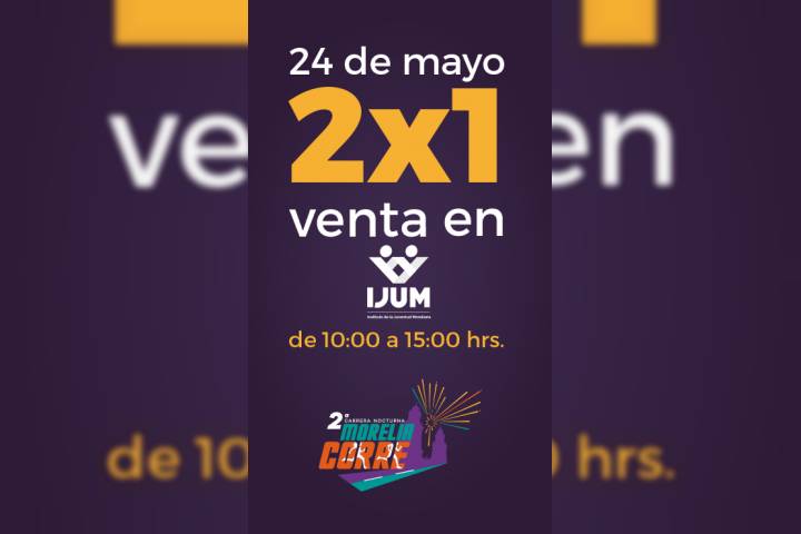 NOTICIAS 24/05/2017Este miércoles, 2x1 en inscripciones a Segunda Carrera Nocturna "Morelia Corre"El Instituto de la Juventud Moreliana (IJUM) puso en marcha una atractiva promoción para aquellos que deseen participar en la Segunda Carrera Nocturna "Morelia Corre", otorgando un dos por uno para los que se registren este miércoles en las oficinas de la dependencia municipal, ubicada en la Avenida Periodismo s/n de la Colonia Nueva Valladolid.