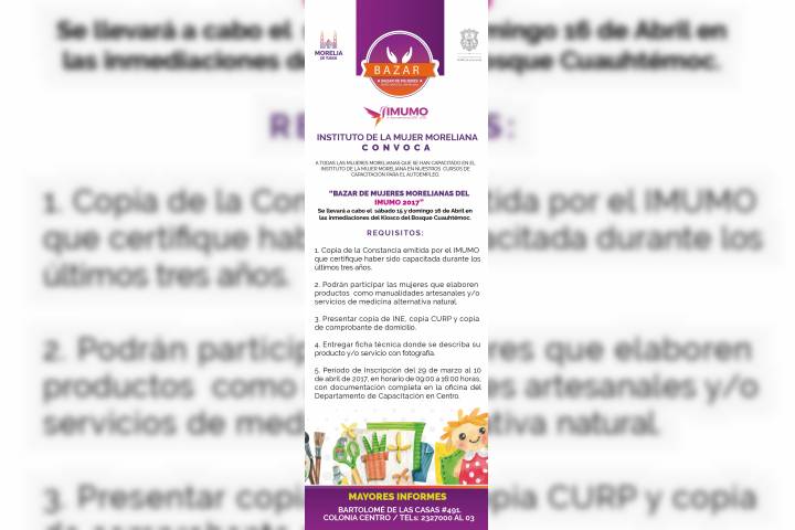 NOTICIAS 11/04/2017IMUMO realizará Bazar de Mujeres Morelianas este próximo fin de semanaLas inmediaciones del Kiosco del Bosque Cuauhtémoc serán sede una vez más del Bazar de Mujeres Morelianas del IMUMO, el cual se llevará a cabo los días sábado 15 y domingo 16 de abril, con un horario de 10:00 a 18:00 horas, ambos días.