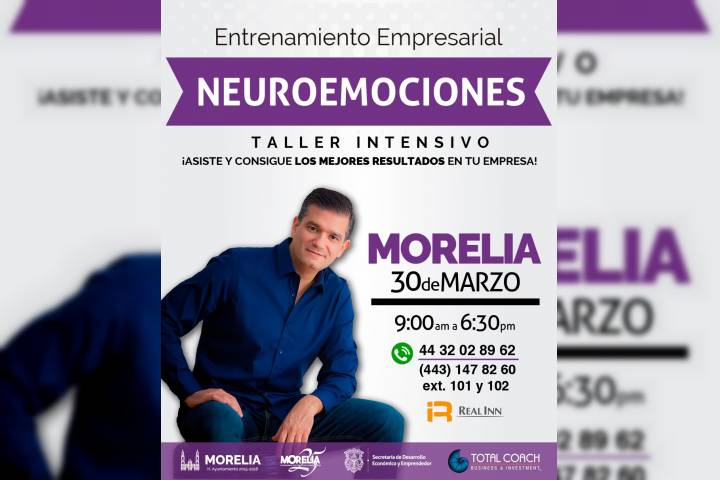 NOTICIAS 24/03/2017Gobierno Municipal promueve taller de capacitación empresarial Con la intención de capacitar a directores, gerentes y dueños de empresas en Morelia, el Ayuntamiento, a través de la SecretarÃa de Desarrollo Económico y Emprendedor y Comunicación Social, invita al taller de couching "Neuro-emociones en tu empresa" que tendrá lugar el próximo dÃa jueves 30 de marzo, de 9:00 a 18:00 horas en el Hotel Real Inn.