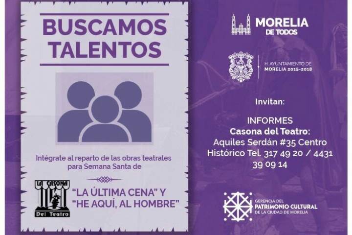 NOTICIAS 06/03/2017Gerencia del Patrimonio Cultural continúa en reclutamiento de talento local Con el fin de que la ciudadanía viva la experiencia de formar parte de lo que se ofrecerá en la agenda de actividades para Semana Santa, la Gerencia del Patrimonio Cultural a cargo de Gaspar Hernández Razo anunció que aún existen espacios para participar y ser parte del elenco de las representaciones "La Última Cena" y "He aquí, al hombre".