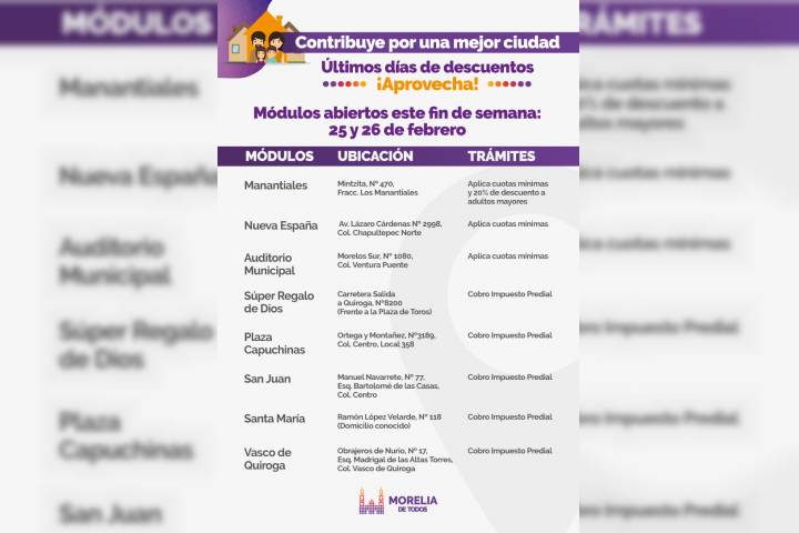 NOTICIAS 24/02/2017Módulos de Tesorería estarán trabajando este fin de semana En apoyo a la economía de los morelianos, este fin de semana la Tesorería habilitará diversos módulos para que la ciudadanía aproveche los últimos días de descuento en el pago del impuesto predial.