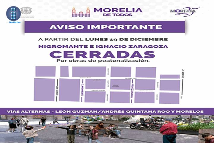 NOTICIAS 18/12/2016Este lunes inicia el Ayuntamiento trabajos previos del proyecto de peatonalización en Centro HistóricoComo parte de las acciones previas a la implementación del proyecto de Peatonalización del Centro Histórico de la ciudad, a partir de este lunes 19 de diciembre del año en curso, el Ayuntamiento de Morelia iniciará con el cierre de las calles Nigromante y Miguel Bernal Jiménez, por lo que exhorta a los automovilistas a tomar rutas alternas de circulación.
