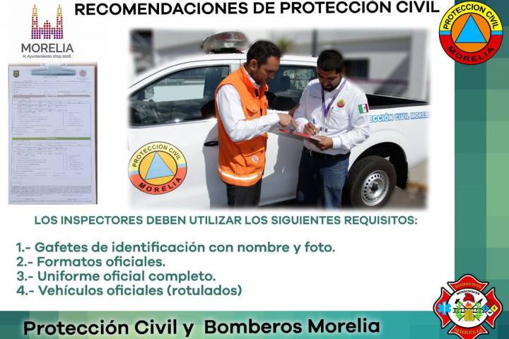 NOTICIAS 27/10/2016PC y Bomberos de Morelia emite recomendaciones a la ciudadanía en víspera del Día de MuertosComo parte de las acciones implementadas por el Ayuntamiento de Morelia para garantizar un buen servicio hacia la ciudadanía durante los operativos de la Coordinación de Protección Civil y Bomberos de Morelia en el marco de las celebraciones y eventos conmemorativos al Día de Muertos, la dependencia municipal informó una serie de recomendaciones a fin de que identifiquen de manera puntual a los inspectores de la corporación.