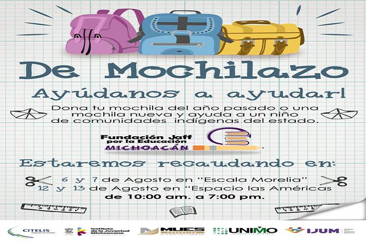 NOTICIAS 11/08/2016IJUM apoya la educación de los sectores más vulnerables Siguiendo las políticas del Presidente Municipal de Morelia, Alfonso Martínez, de establecer lazos de colaboración con instituciones y fundaciones que trabajan en beneficio de los sectores más necesitados de la población, el Instituto de la Juventud Moreliana (IJUM) se ha unido a la campaña "De Mochilazo, Ayúdanos a Ayudar" impulsada por la Fundación Jaff, quienes trabajan constantemente por la educación de los michoacanos.