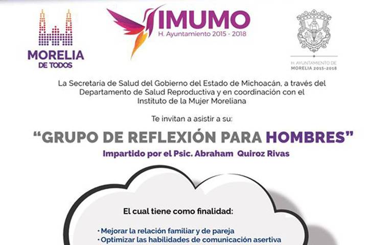 NOTICIAS 21/05/2016Invita IMUMO a participar en los talleres "Grupos de Reflexión"Como parte de las acciones para promover relaciones de parejas sanas, combatir la violencia hacia la mujer y generar una sociedad más equitativa, el Instituto de la Mujer Moreliana (IMUMO), en coordinación con la Secretaría de Salud del Estado, a través del departamento de Salud Reproductiva, invitan a los ciudadanos mayores de 15 años a inscribirse en los "Grupos de Reflexión", que son otorgados de manera gratuita.