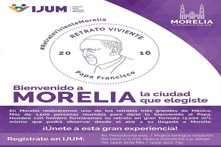 NOTICIAS 31/01/2016Busca IJUM involucrar a la ciudadanía en actividades por arribo del Papa Con el propósito de fomentar la participación e involucrar a los ciudadanos durante las actividades por la visita del Papa a la capital michoacana, el Ayuntamiento de Morelia a través del Instituto de la Juventud Moreliana, invita a las personas de entre 14 a 29 años a participar en la creación de un "Retrato Viviente" del rostro de la máxima autoridad eclesiástica, para darle una bienvenida a Morelia.
