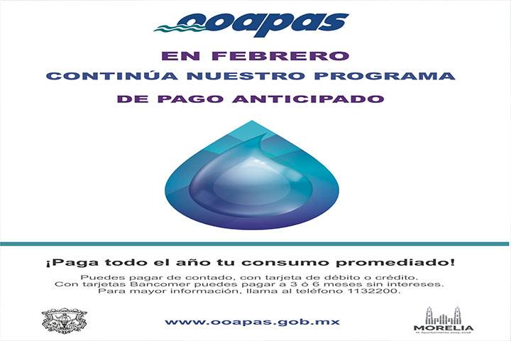 NOTICIAS 01/02/2016Pago anticipado en OOAPAS continuará en febrero Por petición de los usuarios, el Organismo Operador de Agua Potable, Alcantarillado y Saneamiento de Morelia (OOAPAS) extenderá su Programa de Pago Anticipado un mes más, para que las personas interesadas en esta promoción paguen el 2016 basándose en el promedio de sus consumos de agua con las tarifas vigentes de 2015.
