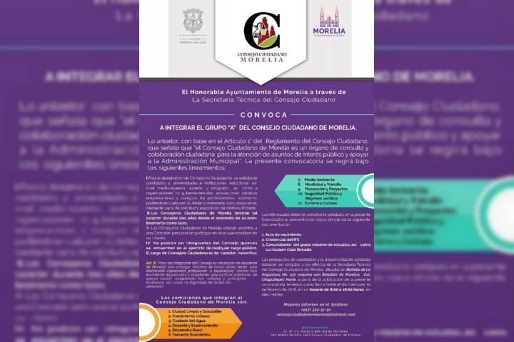 NOTICIAS 02/02/2016Lanzan convocatoria para integrar Consejo Ciudadano Con el objetivo de dar voz a la ciudadanía e integrarla a los asuntos y propuestas de interés público, el Ayuntamiento de Morelia que encabeza Alfonso Martínez Alcázar, lanza una convocatoria a los habitantes de la capital michoacana para integrar el grupo A del Consejo Ciudadano de Morelia.