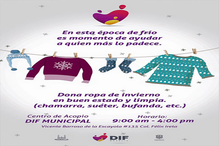 NOTICIAS 15/01/2016DIF Morelia inicia colecta de ropa a favor de quienes más lo necesitanCon la intención de ayudar a quienes más padecen el frío durante esta temporada invernal y fomentar la participación ciudadana, el sistema DIF Morelia, inició este viernes con una colecta de ropa de invierno, misma que será entregada en las comunidades más vulnerables de la capital michoacana.