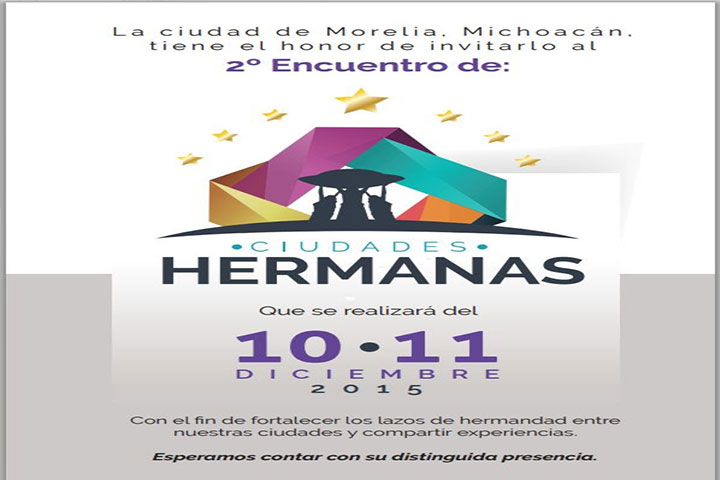 NOTICIAS 23/11/2015Morelia, sede del 2° Encuentro de Ciudades HermanasInteresado en fortalecer los lazos de hermandad y cooperación con otras ciudades, que permitan concretar proyectos que impulsen el desarrollo económico, turístico y social de la capital del estado, el Ayuntamiento llevará a cabo el 2° Encuentro de Ciudades Hermanas Morelia 2015, a celebrase los días 10 y 11 de diciembre.
