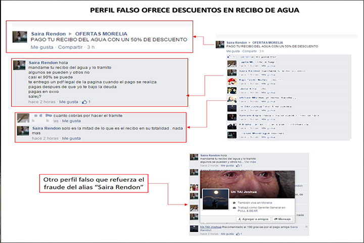 El Organismo Operador de Agua Potable, Alcantarillado y Saneamiento de Morelia (OOAPAS) informa que detectó un perfil falso en la red social Facebook, con el alias "Saira Rendon", que ofrece gestionar el pago del recibo de agua con descuentos de hasta 50%, asegurando que entrega un documento PDF legal.